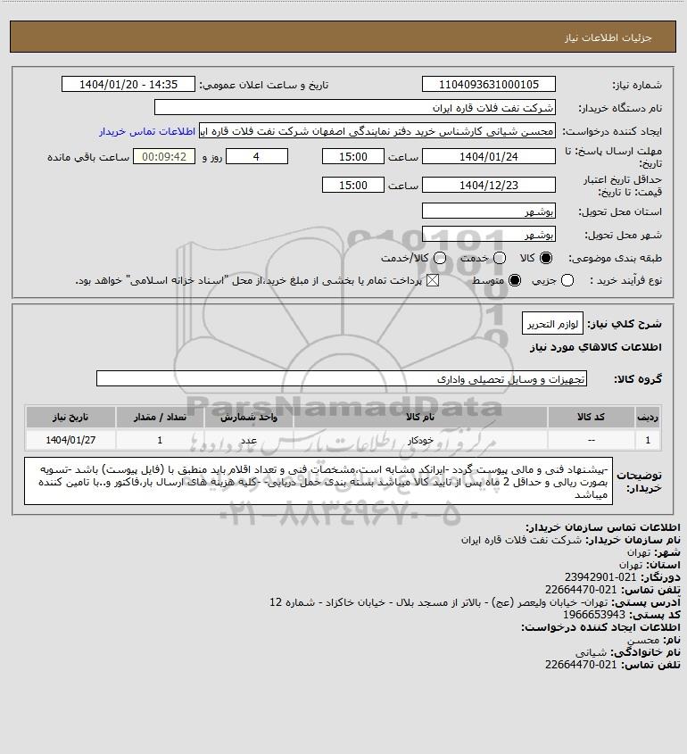 استعلام بها و موضوع استعلام استعلام لوازم التحریر به اطلاع کلیه شرکت‌ها و افراد متخصص واجد شرایط می‌رساند، آگهی گذار در نظر دارد از طریق استعلام بها، نسبت به انتخاب و دریافت پیشنهادات اقدام نماید. این استعلام با کد آگهی ثبت شده در سامانه خبرگزاری پارس نماد : 8850244 منتشر شده است. مشخصات استعلام : تاریخ شروع استعلام: 1404/01/20 آخرین مهلت ارسال پیشنهاد قیمت : 1404/01/24 و محل اجرای پروژه : استان بوشهر میباشد. استعلام قیمت مورد درخواست : استعلام لوازم التحریر با دسته‌بندی‌های تخصصی و گروه های مرتبط : نوشت افزار, استعلام اطلاع رسانی میگردد.