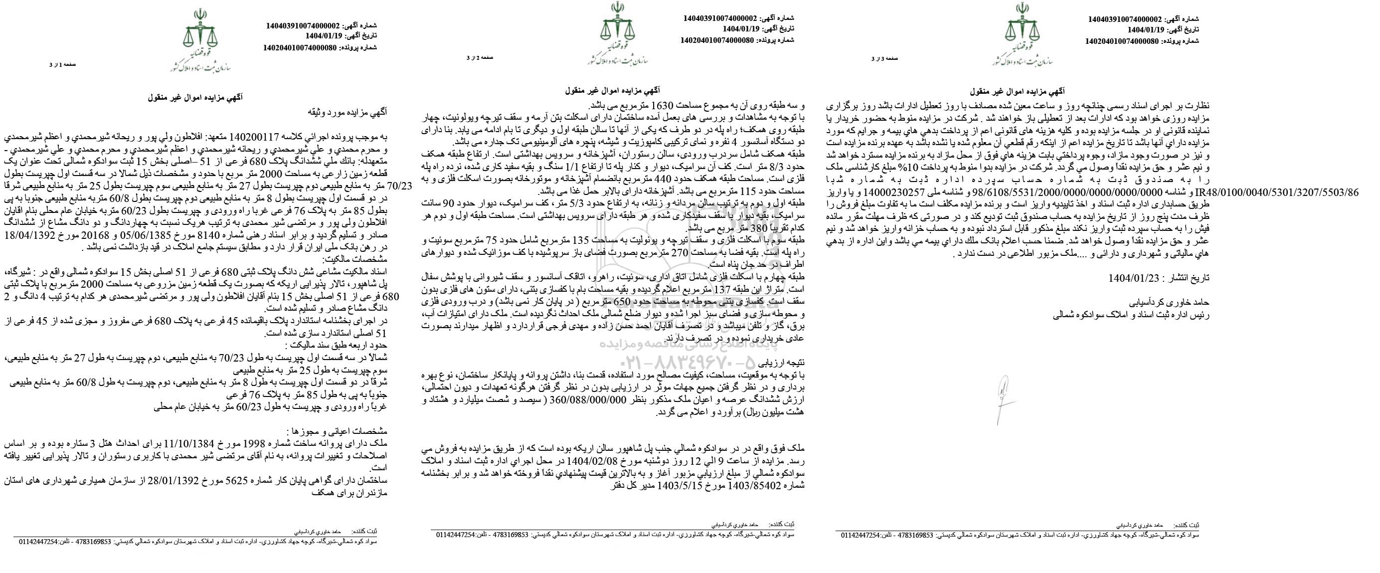 مزایده عمومی مزایده یک قطعه زمین زراعی به مساحت 2000 مترمربع برگزار میگردد. از کلیه افراد متخصص و شرکتهای واجد شرایط دعوت به عمل میآید تا در این مزایده با کد خبرگزاری پارس نماد : 8850404 شرکت نمایند تاریخ شروع مزایده : 1404/01/20 مهلت شرکت در مزایده: تا پایان روز 1404/02/08 مکان برگزاری اموال واگذاری استانهای مازندران و دستهبندیهای مربوط به این حراجی ماشین آلات و تجهیزات کشاورزی و دام پروری, املاک و زمین میباشد.