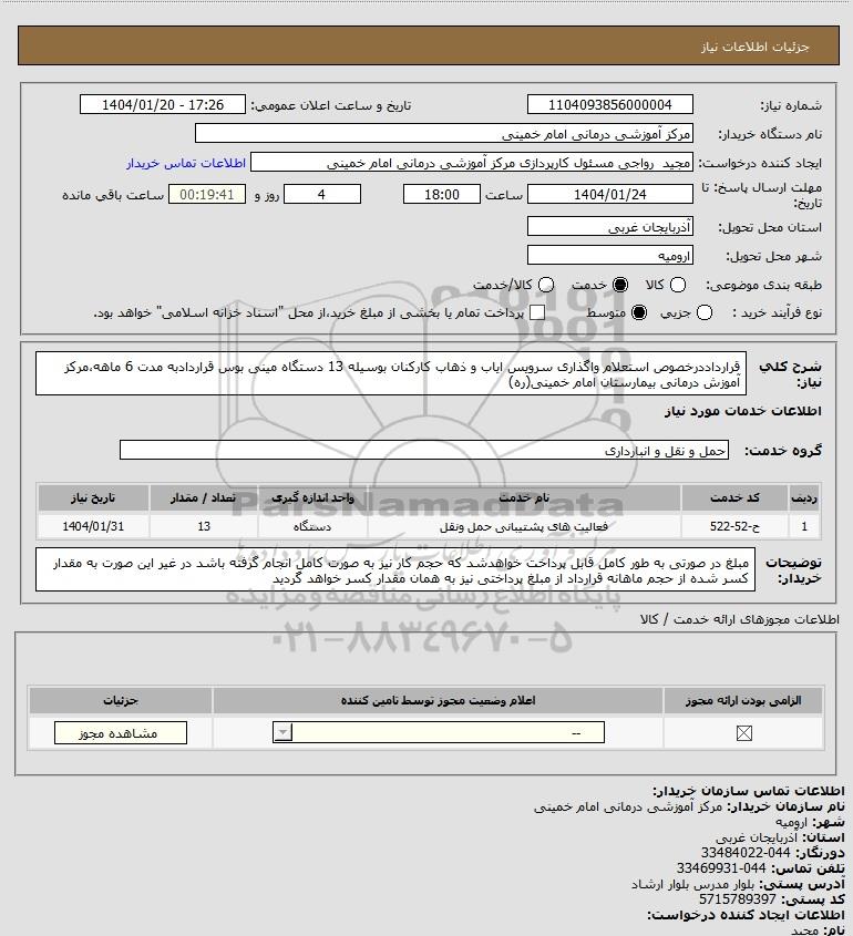 شرح کلی نیاز: قرارداددرخصوص استعلام واگذاری سرویس ایاب و ذهاب کارکنان بوسیله 13 دستگاه مینی بوس قراردادبه مدت 6 ماهه،مرکز آموزش درمانی بیمارستان امام خمینی(ره)