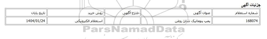 | 168074 | پمپ پنوماتیک شارژ روغن | استعلام الکترونیکی | 1404/01/24 |