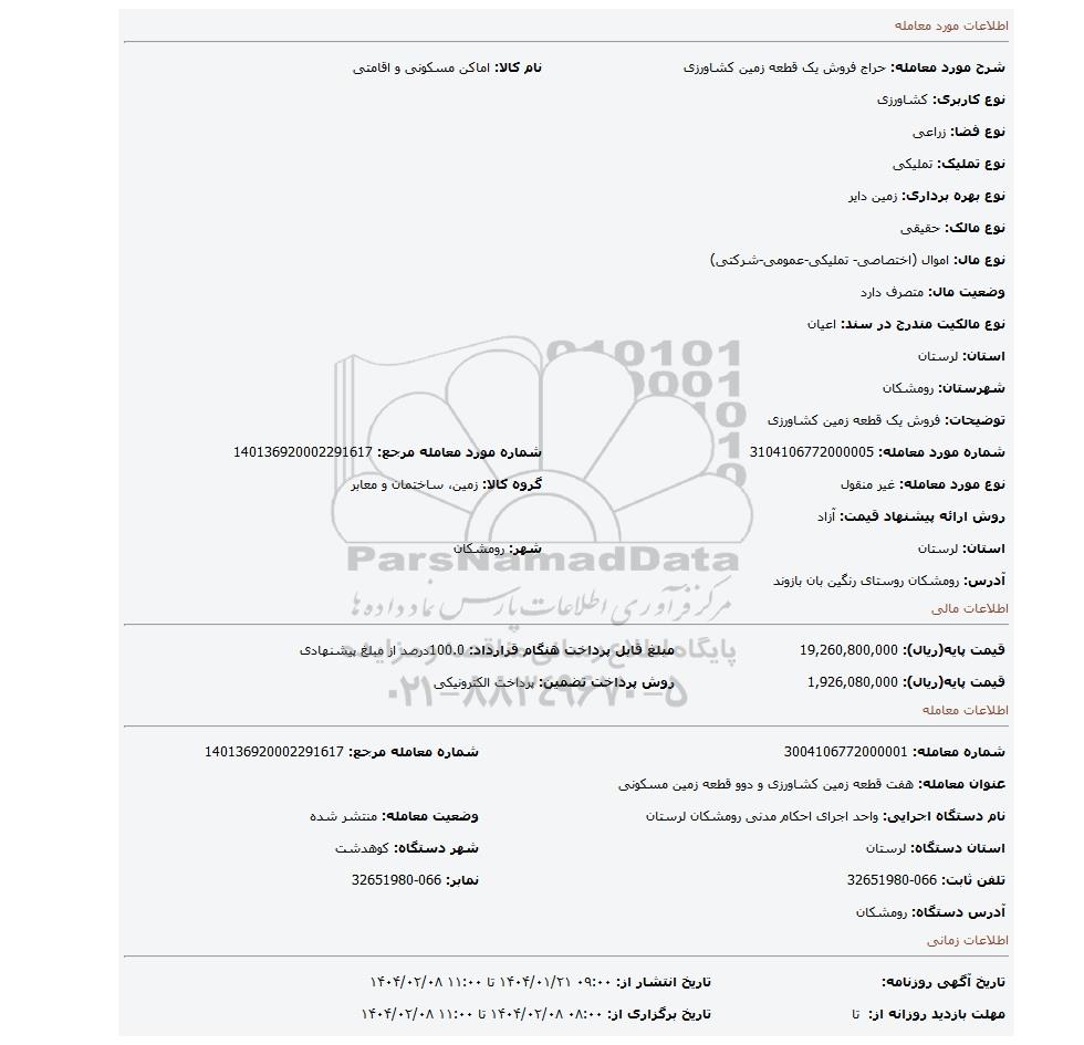 | شرح مورد معامله: حراج فروش یک قطعه زمین کشاورزی | نام کالا: اماکن مسکونی و اقامتی | |