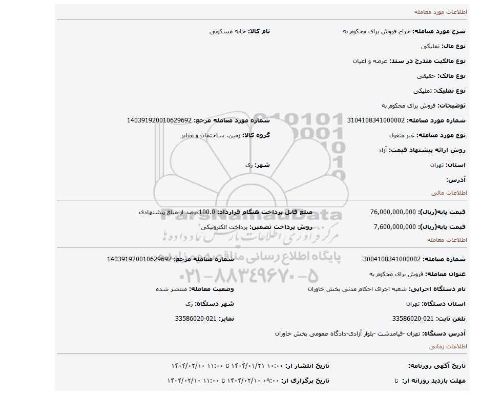 | شماره مورد معامله: 3104108341000002 | شماره مورد معامله مرجع: 140391920010629692 | |