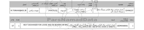 | 52496237 | مبدل حرارتی برای فیکس بیرینگ و لوز بیرینگ آسیاب گن | 1 | ساخت تجهیزات و قطعات یدکی | کشوری | 1404/01/22 | مهدی ترکانی | M.TORKANI@KSC.IR |