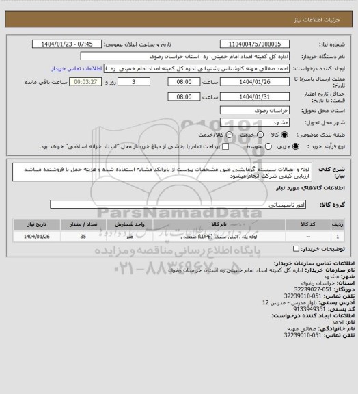 شرح کلی نیاز: لوله و اتصالات سیستم گرمایشی طبق مشخصات پیوست از یایرانکد مشابه استقاده شده و هزینه حمل با فروشنده میباشد ارزیابی کیفی شرکت انجام میشود