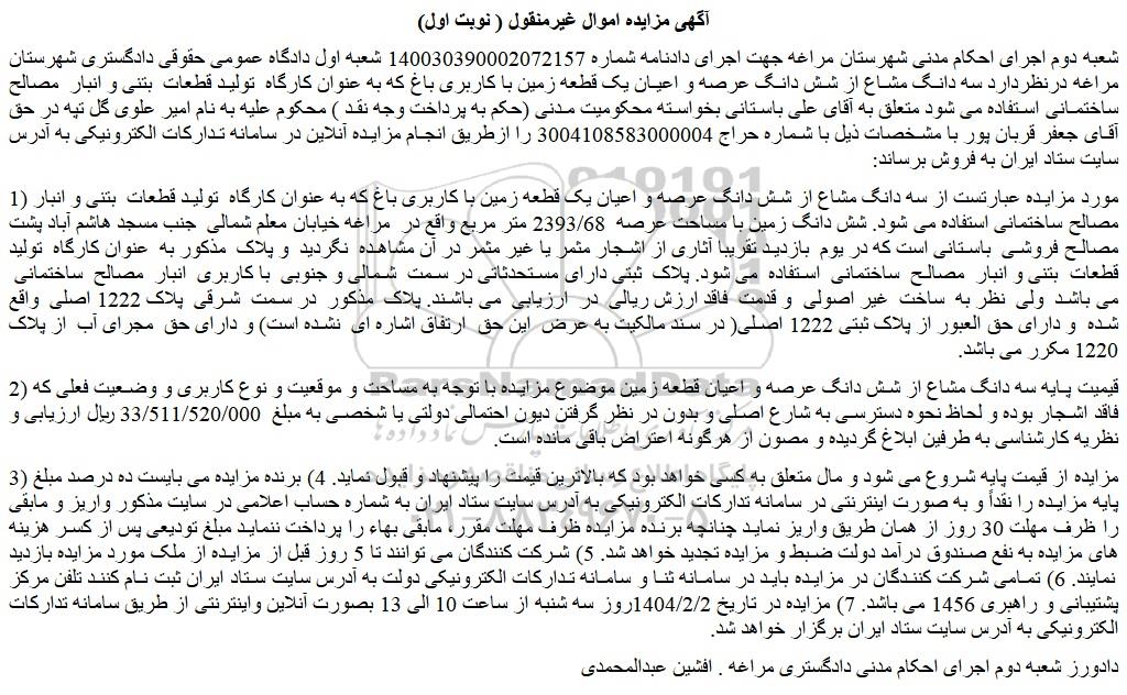 شعبه دوم اجرای احکام مدنی شهرستان مراغه جهت اجرای دادنامه شماره 140030390002072157 شعبه اول دادگاه عمومی حقوقی دادگستری شهرستان مراغه درنظردارد سه دانگ مشاع از شش دانگ عرصه و اعیان یک قطعه زمین با کاربری باغ که به عنوان کارگاه  تولید قطعات  بتنی و انبار  مصالح ساختمانی استفاده می شود متعلق به آقای علی باستانی بخواسته محکومیت مدنی (حکم به پرداخت وجه نقد ) محکوم علیه به نام امیر علوی گل تپه در حق آقای جعفر قربان پور با مشخصات ذیل با شماره حراج 3004108583000004 را ازطریق انجام مزایده آنلاین در سامانه تدارکات الکترونیکی به آدرس سایت ستاد ایران به فروش برساند: