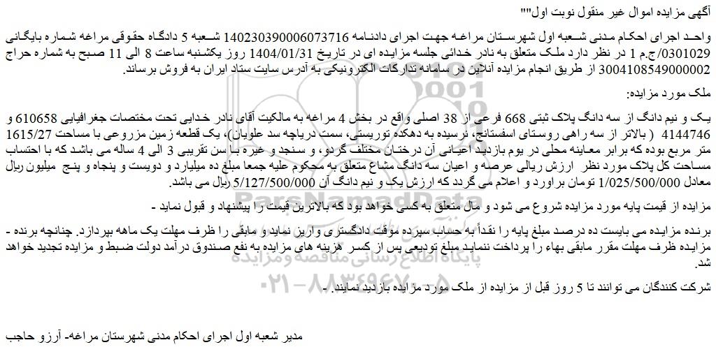واحد اجرای احکام مدنی شعبه اول شهرستان مراغه جهت اجرای دادنامه 140230390006073716 شعبه 5 دادگاه حقوقی مراغه شماره بایگانی 0301029/ج.م 1 در نظر دارد ملک متعلق به نادر خدائی جلسه مزایده ای در تاریخ 1404/01/31 روز یکشنبه ساعت 8 الی 11 صبح به شماره حراج 3004108549000002 از طریق انجام مزایده آنلاین در سامانه تدارکات الکترونیکی به آدرس سایت ستاد ایران به فروش برساند.