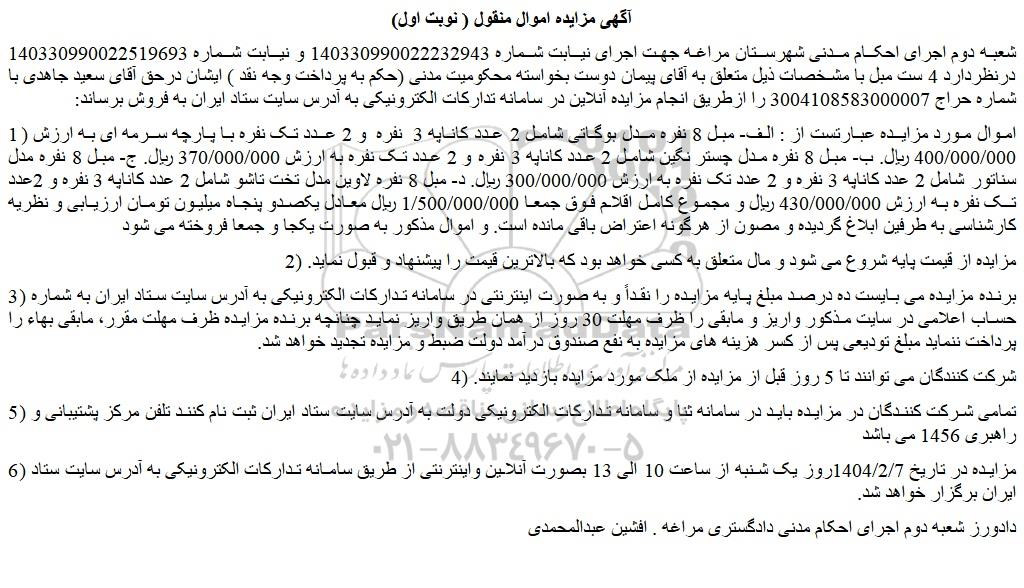 شعبه دوم اجرای احکام مدنی شهرستان مراغه جهت اجرای نیابت شماره 140330990022232943 و نیابت شماره 140330990022519693 درنظردارد 4 ست مبل با مشخصات ذیل متعلق به آقای پیمان دوست بخواسته محکومیت مدنی (حکم به پرداخت وجه نقد ) ایشان درحق آقای سعید جاهدی با شماره حراج 3004108583000007 را ازطریق انجام مزایده آنلاین در سامانه تدارکات الکترونیکی به آدرس سایت ستاد ایران به فروش برساند: