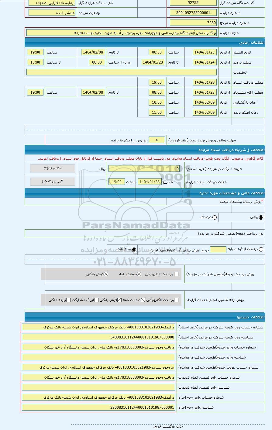 | شماره مورد اجاره | 5104092755000001 | نوع برگزاری مزایده | مزایده عمومی | |