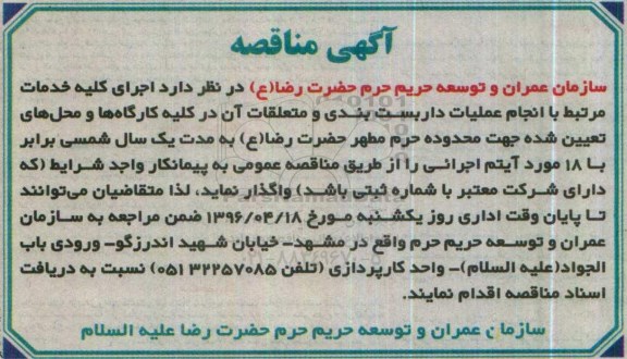 سازمان عمران و توسعه حریم حرم حضرت رضا ( ع) دنظردارد اجرای کلیه خدمات مرتبط با انجام عملیات داربست بندی و متعلقات ان در کلیه کارگاه ها و محل های تعین شده جهت محدوده حرم مطهر حضرت رضا به مدت یک سال شمسی برابر با 18 مورد ایتم اجرائی را ازطریق مناقصه عمومی به پیمانکار واجد شرایط که دارای شرکت معتبر با شماره ثبتی باشند واگذار نماید لذا متقاضیان می توانند تا پایان وقت اداری روز یکشنبه مورخ 96.4.18 ضمن مراجعه به سازمان عمران و توسعه حریم حرم واقع در مشهد خیابان شهید اندرزگو ورودی باب الجواد ( علیه السلام ) واحد کارپردازی تلفن 05132257085 نسبت به دریافت اسناد مناقصه اقدام نمایند