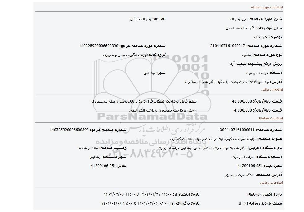 | شرح مورد معامله: حراج یخچال | نام کالا: یخچال خانگی | |
