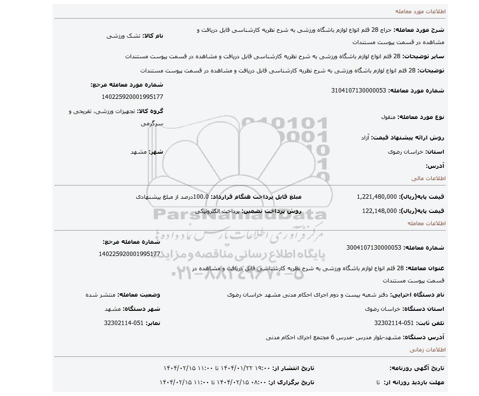 | شماره مورد معامله: 3104107130000053 | شماره مورد معامله مرجع: 140225920001995177 | |