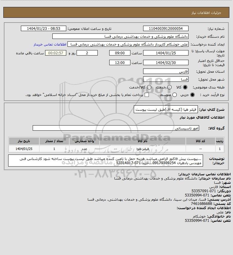 استعلام بها و موضوع استعلام استعلام فیلتر هپا (کیسه ای)طبق لیست پیوست به اطلاع کلیه شرکت‌ها و افراد متخصص واجد شرایط می‌رساند، آگهی گذار در نظر دارد از طریق استعلام بها، نسبت به انتخاب و دریافت پیشنهادات اقدام نماید. این استعلام با کد آگهی ثبت شده در سامانه خبرگزاری پارس نماد : 8855931 منتشر شده است. مشخصات استعلام : تاریخ شروع استعلام: 1404/01/23 آخرین مهلت ارسال پیشنهاد قیمت : 1404/01/25 و محل اجرای پروژه : استان فارس میباشد. استعلام قیمت مورد درخواست : استعلام فیلتر هپا (کیسه ای)طبق لیست پیوست با دسته‌بندی‌های تخصصی و گروه های مرتبط : انواع فیلتر های تصفیه, تاسیسات ساختمانی, استعلام اطلاع رسانی میگردد.
