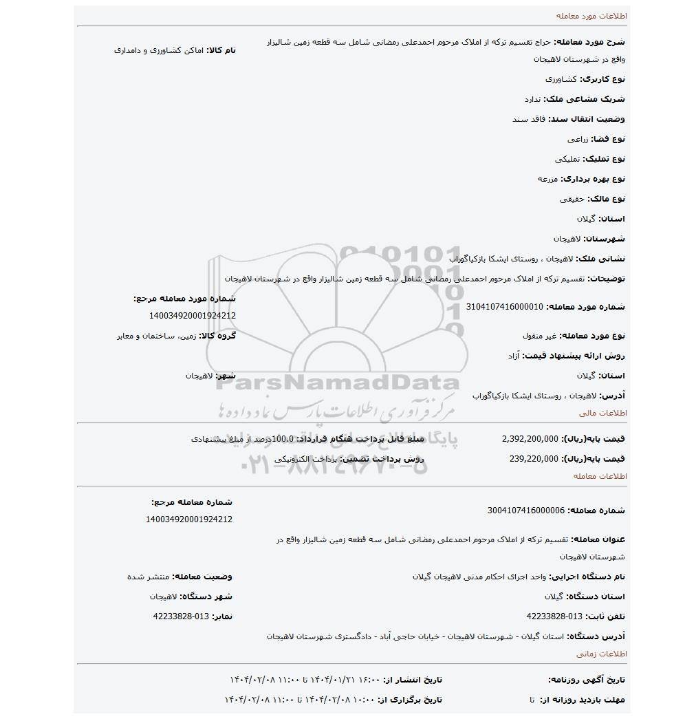 | شرح مورد معامله: حراج تقسیم ترکه از املاک مرحوم احمدعلی رمضانی شامل سه قطعه زمین شالیزار واقع در شهرستان لاهیجان | نام کالا: اماکن کشاورزی و دامداری | |