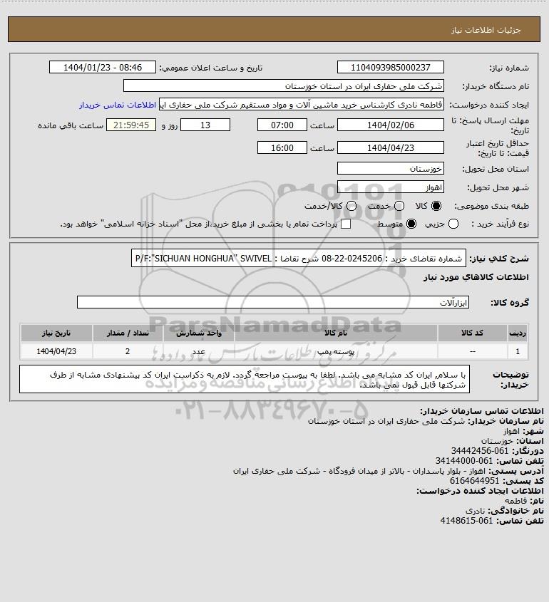شرح کلی نیاز: شماره تقاضای خرید : 0245206-22-08 شرح تقاضا : P/F:"SICHUAN HONGHUA" SWIVEL