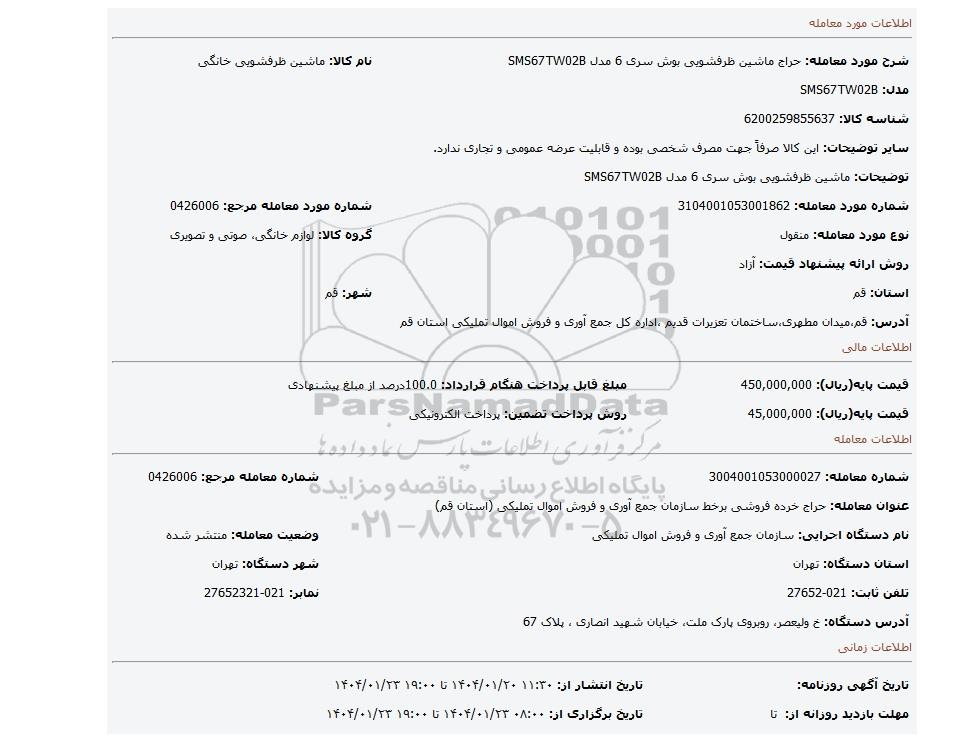 | شرح مورد معامله: حراج ماشین ظرفشویی بوش سری 6 مدل SMS67TW02B | نام کالا: ماشین ظرفشویی خانگی | |