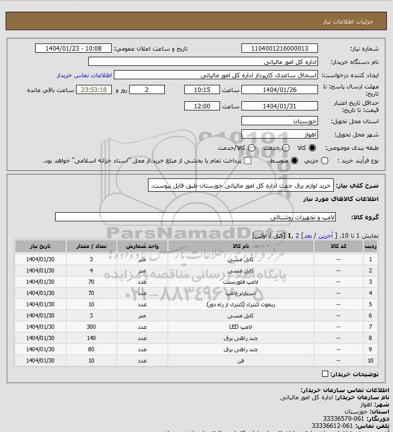 شرح کلی نیاز: خرید لوازم برق جهت اداره کل امور مالیاتی خوزستان طبق فایل پیوست.