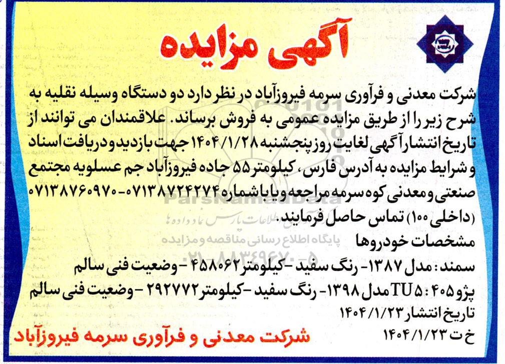 شرکت معدنی و فرآوری سرمه فیروزآباد در نظر دارد دو دستگاه وسیله نقلیه به شرح زیر را از طریق مزایده عمومی به فروش برساند. علاقمندان می توانند از تاریخ انتشار آگهی لغایت روز پنجشنبه 1404.1.28 جهت بازدید و دریافت اسناد و شرایط مزایده به آدرس ،فارس، کیلومتر 55 جاده فیروزآباد جم عسلویه مجتمع صنعتی و معدنی کوه سرمه مراجعه و یا با شماره 07138724274 - 07138760970 داخلی 100 تماس حاصل فرمایند.