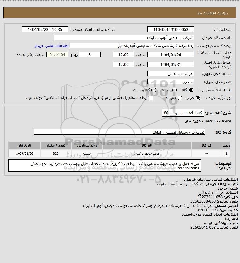 شرح کلی نیاز: کاغذ A4 سفید وزن 80g
