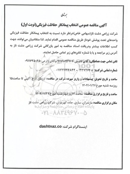 شرکت زراعی دشت ناز (سهامی خاص) در نظر دارد نسبت به انتخاب پیمانکار حفاظت فیزیکی واحدهای تحت پوشش خود از طریق مناقصه عمومی اقدام نماید. لذا متقاضیان می توانند جهت کسب اطلاعات بیشتر و دریافت اسناد مناقصه به امور بازرگانی شرکت زراعی دشت ناز به آدرس زیر مراجعه و یا با شماره تلفن های زیر تماس حاصل نمایند.