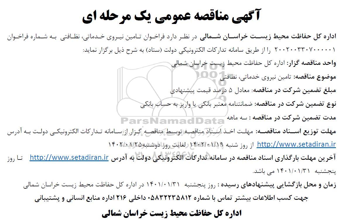 اداره کل حفاظت محیط زیست خراسان شمالی در نظر دارد فراخوان تامین نیروی خدماتی،نظافتی به شماره فراخوان 2002003307000001 را از طریق سامانه تدارکات الکترونیکی دولت ستاد به شرح ذیل برگزار نماید: