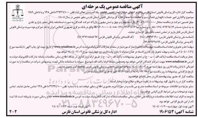 موضوع : واگذاری امور خدمات نگهداری فضای سبز و تنظیفات واحدهای اداره کل پزشکی قانونی استان فارس بطور حجمی در سال 1404