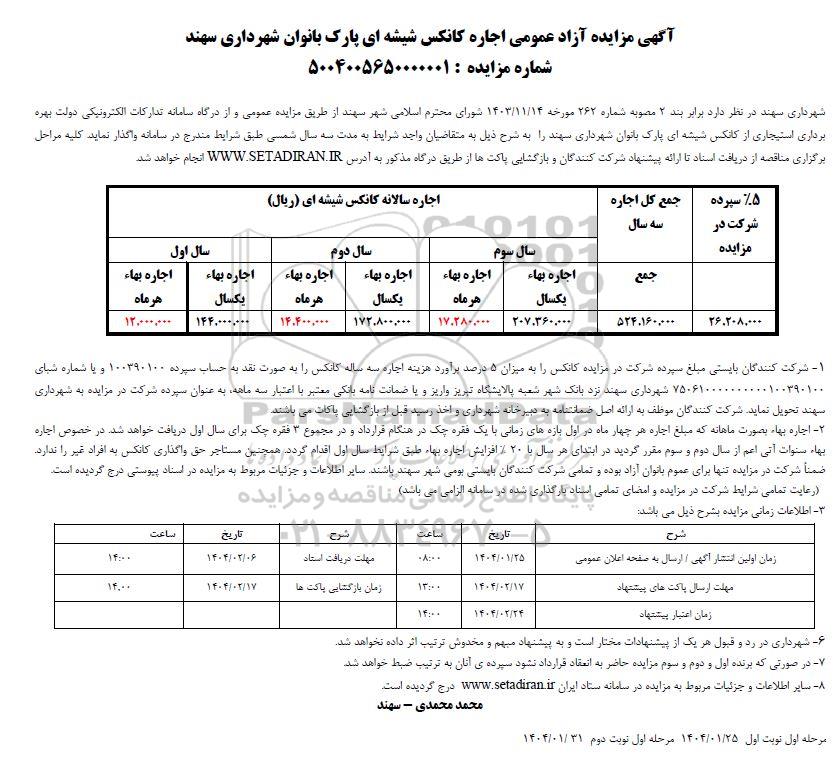 شهرداری سهند در نظر دارد برابر بند 2 مصوبه شماره 262 مورخه 1403.11.14 شورای محترم اسلامی شهر سهند از طریق مزایده عمومی و از درگاه سامانه تدارکات الکترونیکی دولت بهره برداری استیجاری از کانکس شیشه ای پارک بانوان شهرداری سهند را به شرح ذیل به متقاضیان واجد شرایط به مدت سه سال شمسی طبق شرایط مندرج در سامانه واگذار نماید. کلیه مراحل برگزاری مناقصه از دریافت اسناد تا ارائه پیشنهاد شرکت کنندگان و بازگشایی پاکتها از طریق درگاه مذکور به آدرس ستاد ایران انجام خواهد شد.