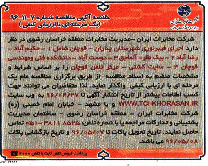 شرکت مخابرات ایران - مدیریت مخابرات منطقه خراسان رضوی درنظردارد اجرای