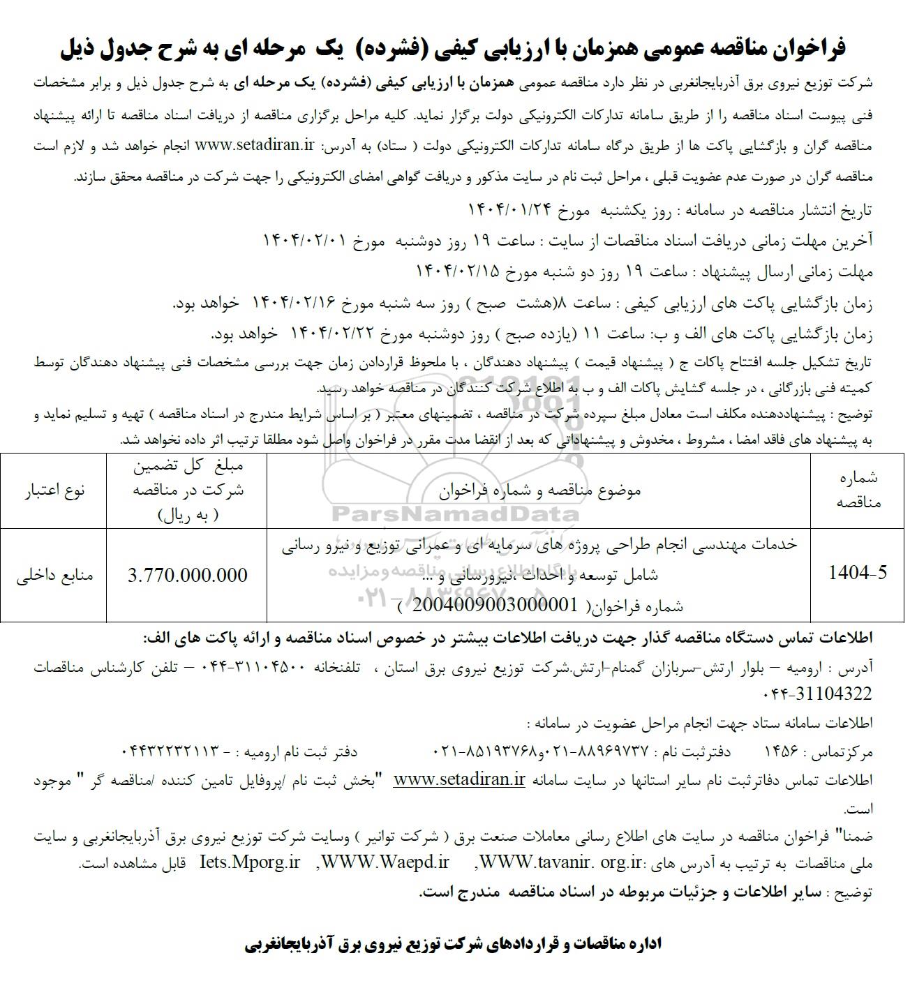 | 1404-5 | خدمات مهندسی انجام طراحی پروژه های سرمایه ای و عمرانی توزیع و نیرو رسانی و شامل توسعه و احداث نیرورسانی و ..... شماره فراخوان 2004009003000001 | 3.770.000.000 | منابع داخلی |