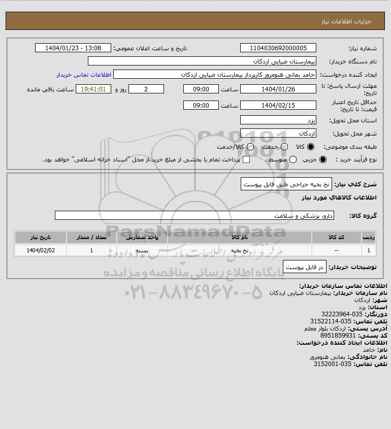 شرح کلی نیاز: نخ بخیه جراحی طبق فایل پیوست