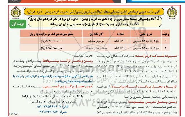 مزایده فروش یخ در قالب 25 کیلویی -مزایده روز شنبه بیست و سوم فروردین ماه 1404, مزایده فروش یخ در قالب 25 کیلویی