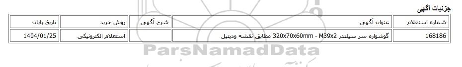 | 168186 | گوشواره سر سیلندر 320x70x60mm - M39x2 مطابق نقشه ودیتیل | استعلام الکترونیکی | 1404/01/25 |