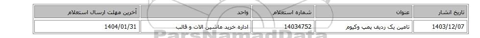 1403/12/07تامین یک ردیف پمپ ‎وکیوم14034752اداره خرید ماشین الات و قالب1404/01/31