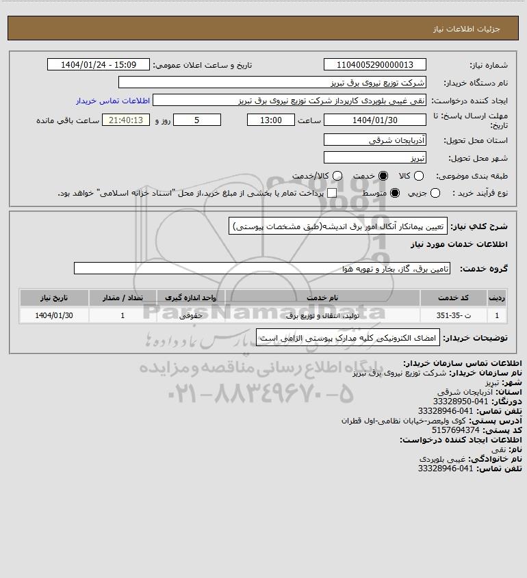 شرح کلی نیاز: تعیین پیمانکار آنکال امور برق اندیشه(طبق مشخصات پیوستی)