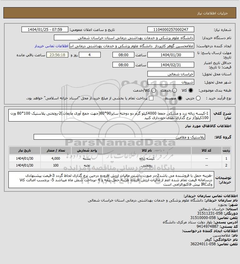 شرح کلی نیاز: 1-کیسه زباله زرد و مشکی جمعا 4000کیلو گرم دو دوخته سایز90*80(جهت جمع آوری مایعات)2-روتختی پلاستیک 100*80 وزن 100کیلو(از نرخ گذاری نقدی خودداری کنید