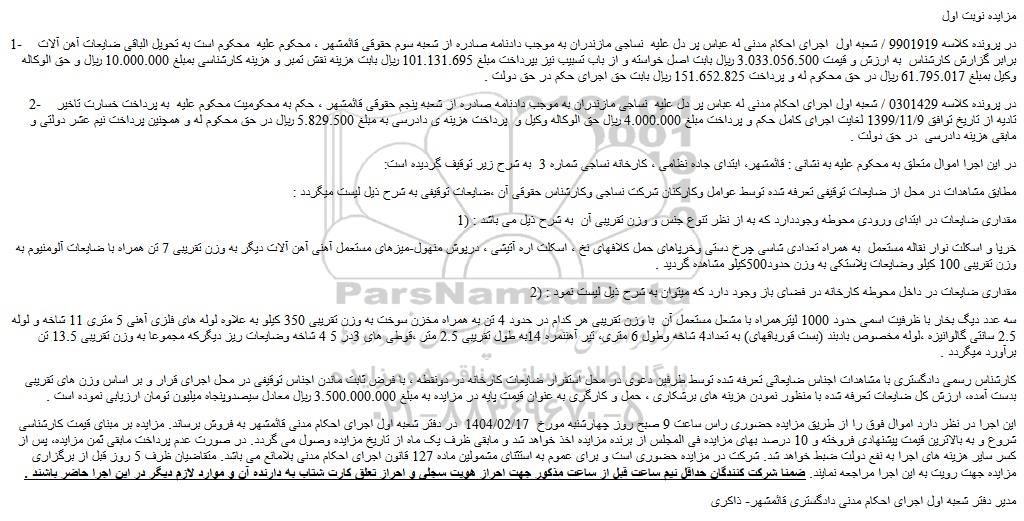 1- در پرونده کلاسه 9901919 / شعبه اول اجرای احکام مدنی له عباس پر دل علیه نساجی مازندران به موجب دادنامه صادره از شعبه سوم حقوقی قائمشهر ، محکوم علیه محکوم است به تحویل الباقی ضایعات آهن آلات برابر گزارش کارشناس به ارزش و قیمت 3.033.056.500 ریال بابت اصل خواسته و از باب تسبیب نیز بپرداخت مبلغ 101.131.695 ریال بابت هزینه نقش تمبر و هزینه کارشناسی بمبلغ 10.000.000 ریال و حق الوکاله وکیل بمبلغ 61.795.017 ریال در حق محکوم له و پرداخت 151.652.825 ریال بابت حق اجرای حکم در حق دولت .