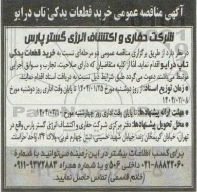 شرکت حفاری و اکتشاف انرژی گستر پارس در نظر دارد از طریق برگزاری مناقصه عمومی دو مرحله ای نسبت به خرید قطعات یدکی تاپ درایو اقدام نماید. لذا از متقاضیان که دارای صلاحیت، تجارب و سوابق اجرایی مرتبط می باشند دعوت می گردد طبق شرایط ذیل نسبت به دریافت اسناد اقدام نمایند.