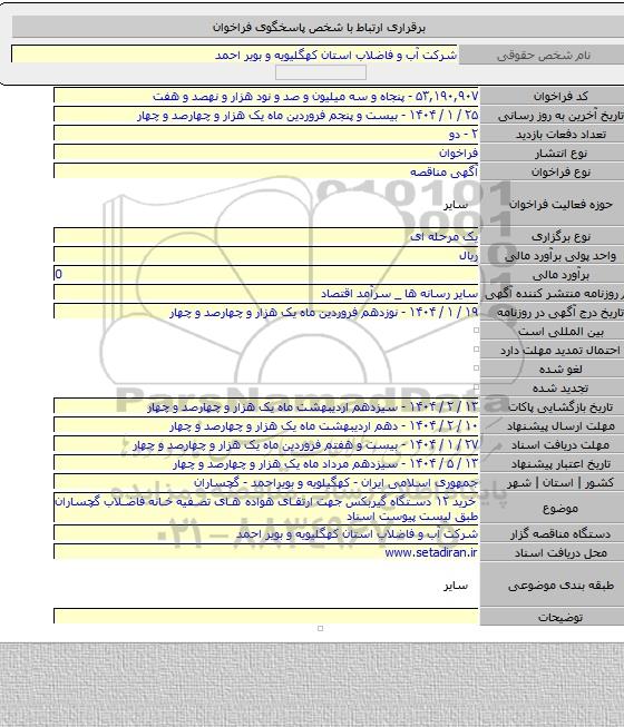 علاقهمندان میتوانند جهت دریافت اسناد و اطلاعات تکمیلی، مناقصه خرید ۱۲ دستگاه گیربکس جهت ارتقای هواده های تصفیه خانه فاضلاب گچساران طبق لیست پیوست اسناد با سامانه مناقصات و مزایدات ایران پارسنماد داده ها 88349670 تماس حاصل نمایند.