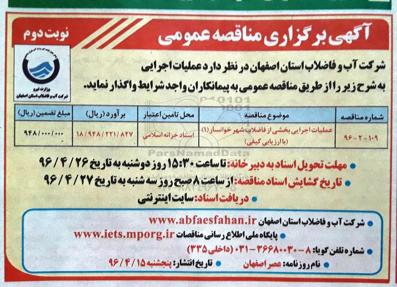 مناقصه عملیات اجرایی بخشی از فاضلاب شهر خوانسار 1 نوبت دوم , مناقصه ، مناقصه عملیات اجرایی بخشی از فاضلاب شهر خوانسار 1 نوبت دوم