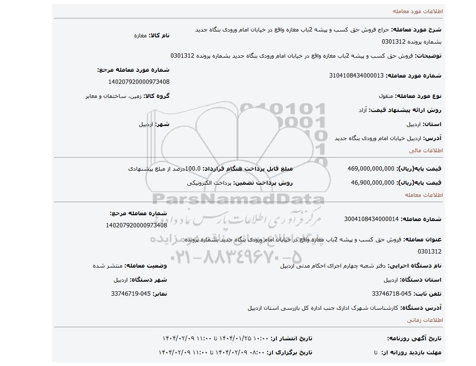 عنوان معامله: فروش حق کسب و پیشه 2باب مغازه واقع در خیابان امام ورودی بنگاه جدید بشماره پرونده 0301312 | ||