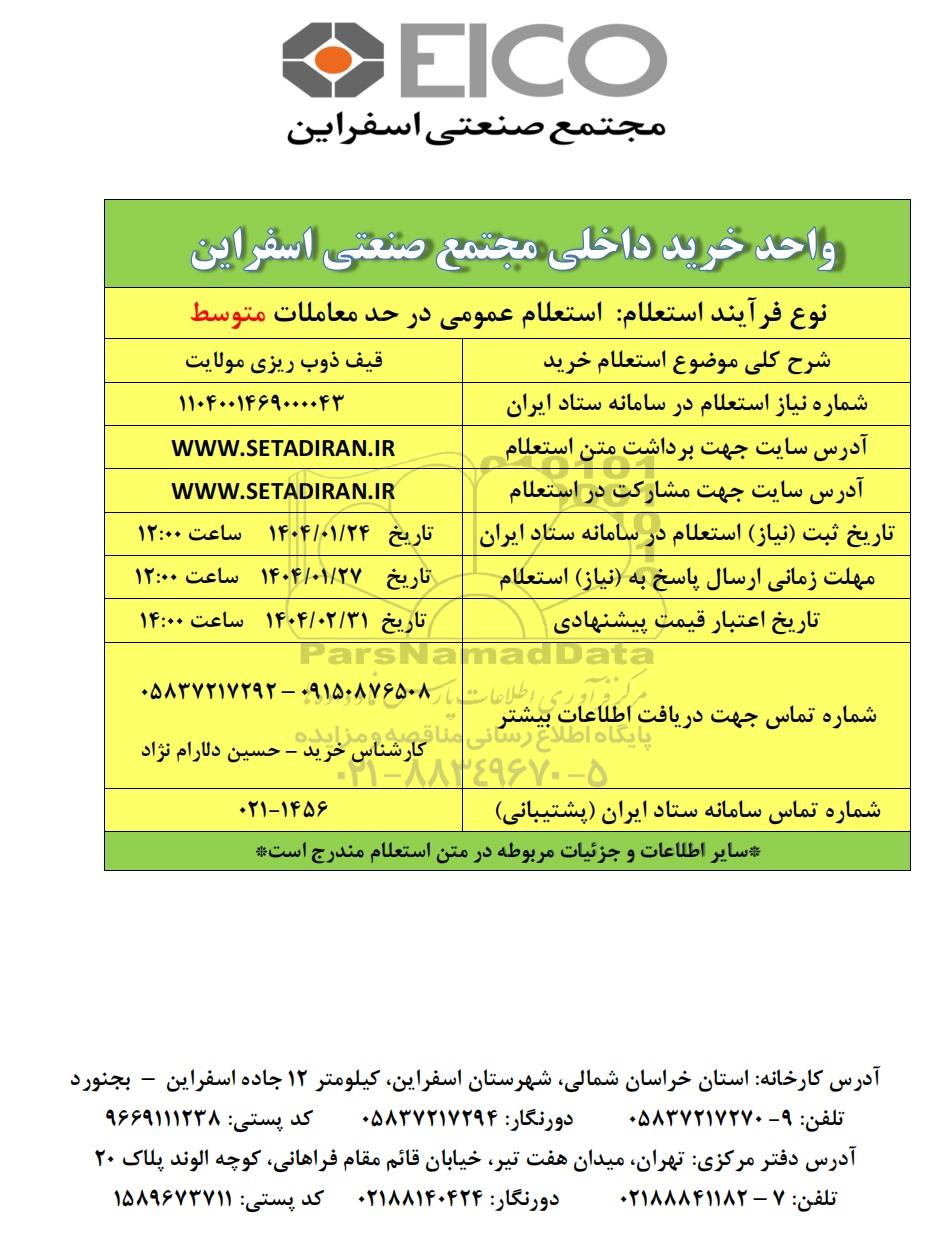 شرح کلی موضوع استعلام خرید: قیف ذوب ریزی مولایت