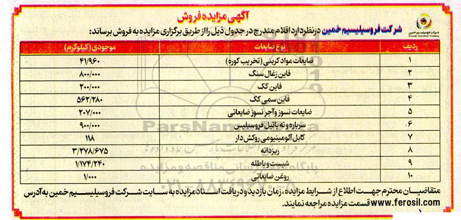 شرکت فروسیلیسیم خمین در نظر دارد اقلام مندرج در جدول زیر را از طریق برگزاری مزایده به فروش برساند.