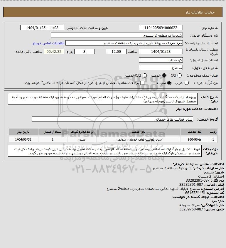 شرح کلی نیاز: پروژه اجاره یک دستگاه کمپرسی تک ده تن(شماره دو) جهت انجام امورات عمرانی محدوده شهرداری منطقه دو سنندج و ناحیه منفصل شهری نایسر(مرحله چهارم)