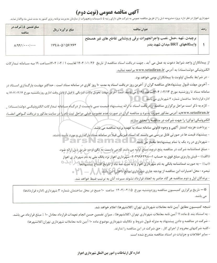 مناقصه برچیدن، تهیه، حمل، نصب و اجرا تجهیزات برقی و روشنایی تقاطع های غیرهمسطح و ایستگاههای BRT میدان شهید بندر - نوبت دوم از کلیه افراد متخصص و شرکتها واجد شرایط دعوت به عمل میآید در مناقصه با کد خبرگزاری پارس نماد: 8871197 شرکت نمایند.