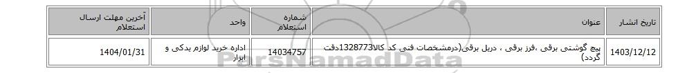 | 1403/12/12 | پیچ گوشتی برقی ،فرز برقی ، دریل برقی(درمشخصات فنی کد کالا1328773دقت گردد) | 14034757 | اداره خرید لوازم یدکی و ابزار | 1404/01/31 |