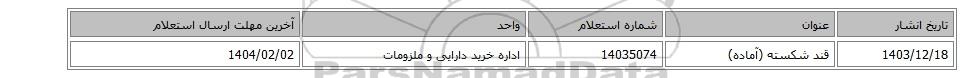 | 1403/12/18 | قند شکسته (آماده) | 14035074 | اداره خرید دارایی و ملزومات | 1404/02/02 |