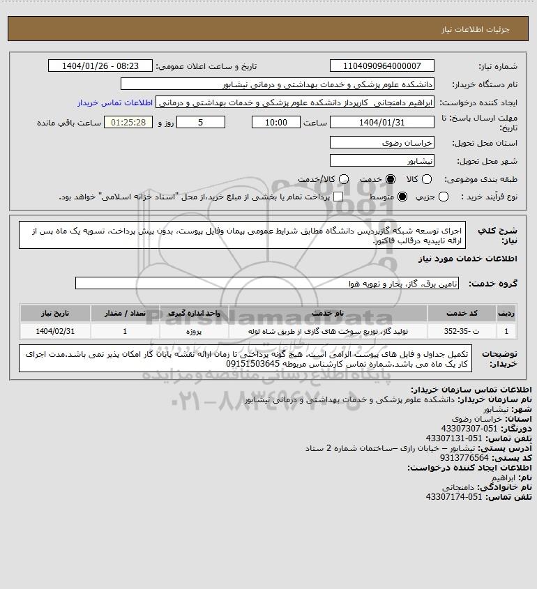 شرح کلی نیاز: اجرای توسعه شبکه گازپردیس دانشگاه مطابق شرایط عمومی پیمان وفایل پیوست، بدون پیش پرداخت، تسویه یک ماه پس از ارائه تاییدیه درقالب فاکتور.