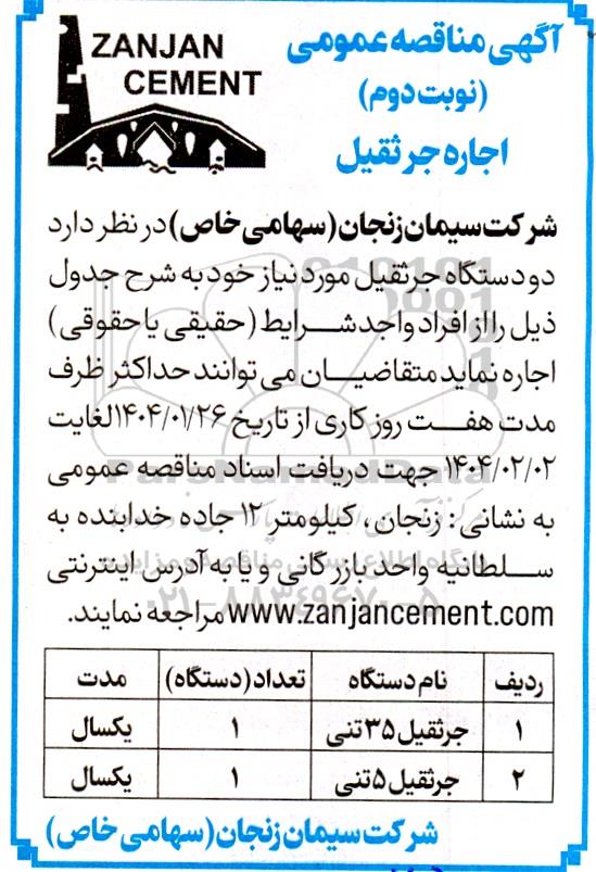شرکت سیمان زنجان (سهامی خاص) در نظر دارد دو دستگاه جرثقیل مورد نیاز خود به شرح جدول ذیل را از افراد واجد شرایط (حقیقی یا حقوقی) اجاره نماید. متقاضیان می توانند حداکثر ظرف مدت هفت روز کاری از تاریخ 1404.1.26 لغایت 1404.2.2 جهت دریافت اسناد مناقصه عمومی به نشانی زنجان، کیلومتر 12 جاده خدابنده به سلطانیه، واحد بازرگانی و یا به آدرس اینترنتی www.zanjancement.com مراجعه نمایند.