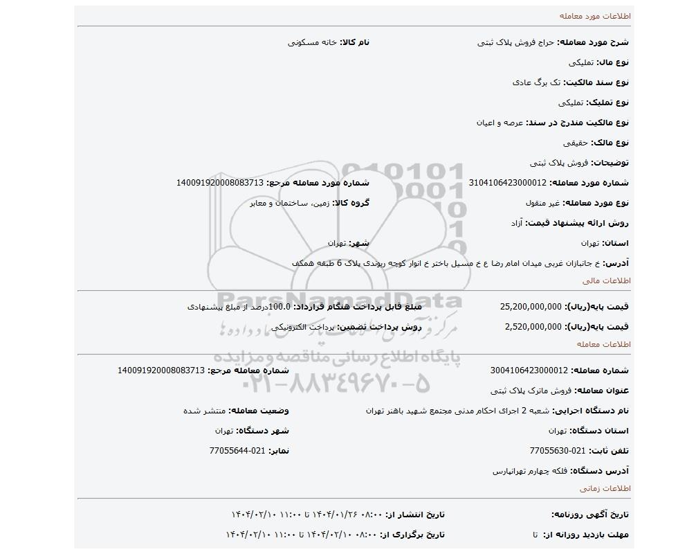 | شرح مورد معامله: حراج فروش پلاک ثبتی | نام کالا: خانه مسکونی | |