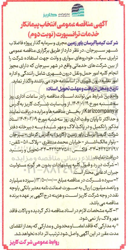 شرکت کیمیا آبرسان یاور زمین مجری و سرمایه گذار پروژه فاضلاب شهر سیرجان در نظر دارد از طریق برگزاری مناقصه عمومی ترابری سبک خودروهای سواری و وانت جهت استفاده شرکت را از بین شرکتهای خدماتی واقع در شهر سیرجان که دارای مجوز انجام کلیه امور حمل و نقل درون شهری شامل رانندگی و اداره امور نقلیه درون شهری در اساسنامه خود می باشند واگذار نماید.