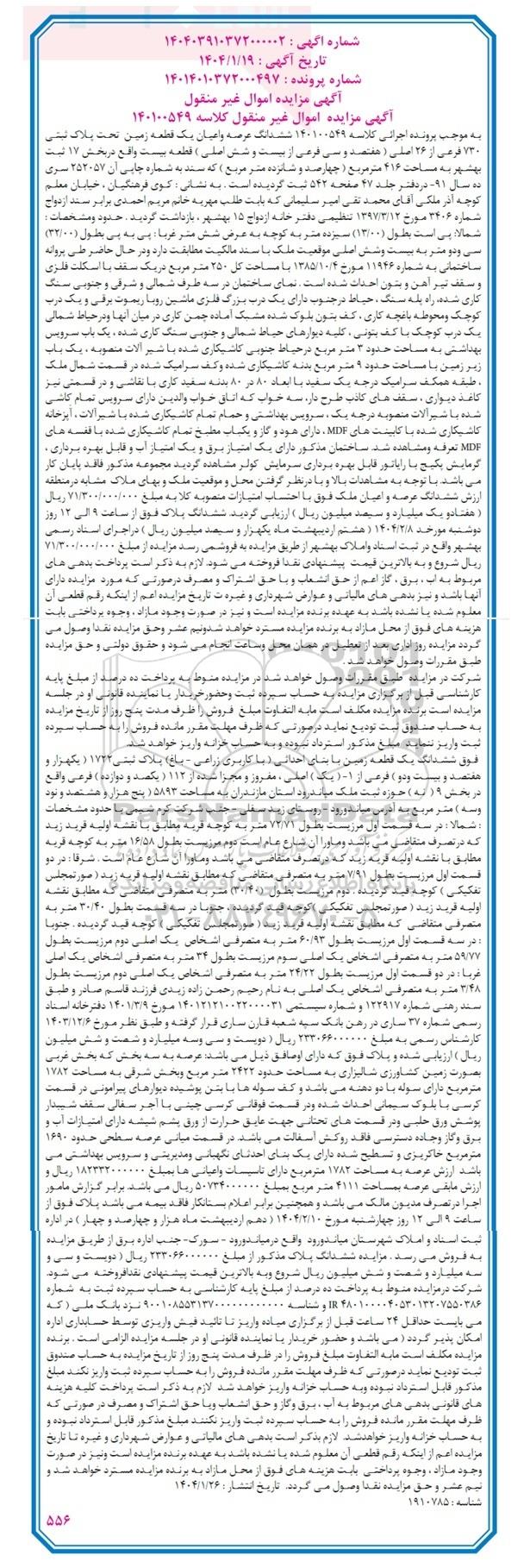 مزایده ششدانک عرصه و اعیان زمین 730 فرعی از 26 اصلی کلاسه 140100549